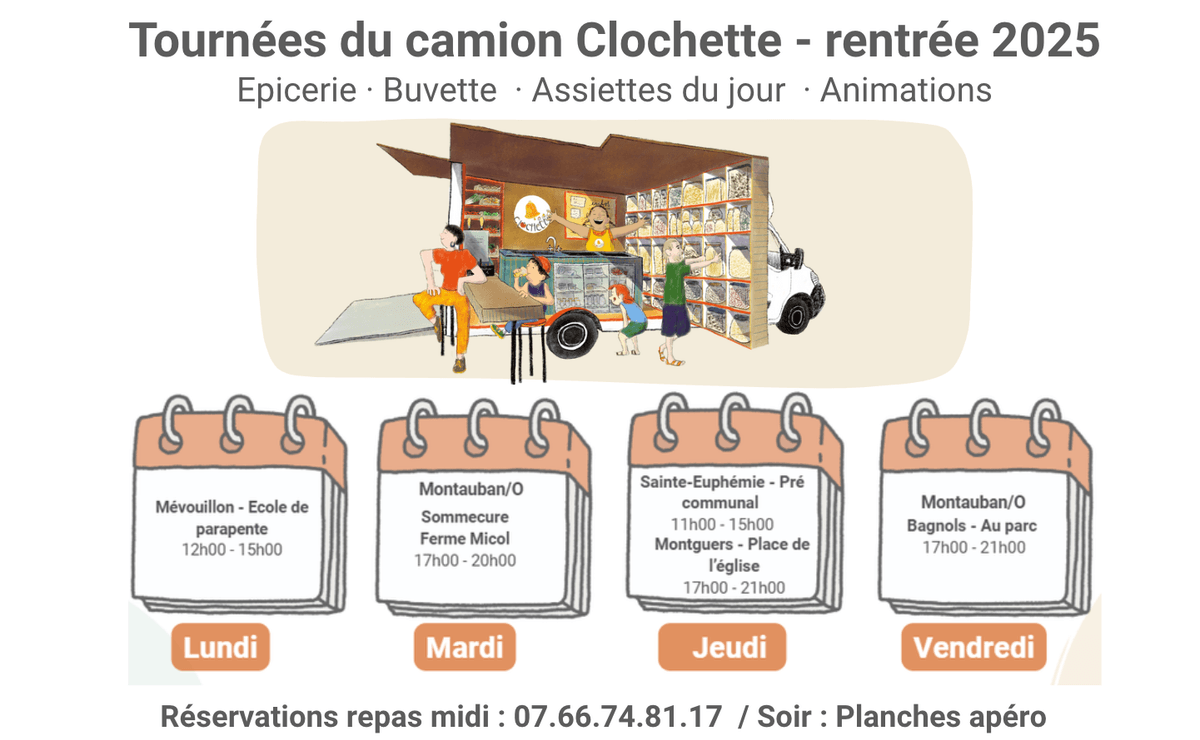 September 12, 2025September 10, 2025Visite de Marie Pochon, députée de circonscription, du camion Guinguette épicerie itinérante...August 21, 2025Retrouvez le camion Guinguette épicerie itinérante Clochette sur France 3 Rhône-Alpes ! https:/...August 6, 2025Depuis mi juillet, le camion Clochette s'est élancé sur les routes !July 21, 2025Besoin de vous ! L’association Clochette mène actuellement un diagnostic participatif pour...June 14, 2025Greg et Marie sont descendus au Pays Basque, chez David et Cyriaque, récupérer le camion aménagé....June 8, 2025Organisé avec la complicité des Lointaines, Du Festival du Maki et de la commission culture et...May 28, 2025Avec la contribution de Soliha et de Mistrigri Et la participation des familles et parents d'él...April 8, 2025Clochette organise un premier repas dans le cadre de Bien manger, Bien vieillirMarch 13, 2025PERMANENCE PRÊT DE JEUX TOUS LES TROISIEMES JEUDIS DU MOIS Ả LA SALLE DES FETES DE MONTAUBAN...March 5, 2025Le dernier Samedis Jouons ! (et Mangeons) avec Mistrigri a été un tel succès que ça nous a donné...February 17, 2025On parle de nous ! Ensemble ici - Baronnies met en avant le Projet Clochette dans leur...February 17, 2025Le prochain rendez-vous dans le cadre de notre partenariat avec Les Lointaines - Festival...February 6, 2025Clochette était à FERRANDI Paris, l’école française de gastronomie & de management hôtelier, aux...December 15, 2024Dimanche 15 décembre c’était la fête de Noël à Montauban/O, avec Les Lointaines - Festival...November 30, 2024Le premier test de commande groupé a eu lieu ce samedi, avec la distribution à Montguers. Pour...November 8, 2024🔔Il y a quelques mois, notre route a croisé celle de David Billy ; avec son associé, David...November 4, 2024🔔 Cette semaine, nous avons eu la joie d’accueillir Gabi Teron, chargée de projet Alimentation et...November 3, 2024Il y a quelques semaines, l'équipe est allée à la rencontre des élus de Sainte-Euphémie du Ouvèze...Cette semaine, nous avons eu la joie de croiser la route de Morgane Marchand de Laso, cheffe de l...Plus d'articlesL'équipe